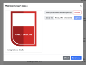 Ogni badge può (e dovrebbe) essere arricchito con un’immagine rappresentativa che ne migliori la leggibilità e l’impatto visivo per l’utente finale.Anche se è tecnicamente possibile pubblicare un badge senza immagine, si sconsiglia vivamente di farlo: in assenza di icona, nella piattaforma l’utente visualizzerà uno spazio vuoto, riducendo l’efficacia comunicativa e l’impatto motivazionale del badge stesso.