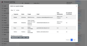 L’andamento dei badge può essere tracciato anche attraverso la reportistica avanzata della piattaforma. Per saperne di più su come navigare tra i report e trovare le informazioni utili legate ai badge, si rimanda all’articolo: “Orientarsi nella reportistica di TLP“.